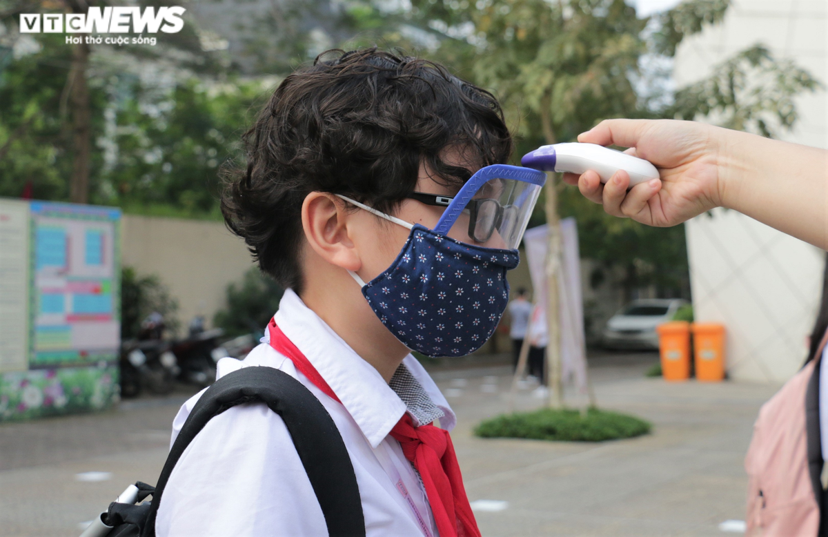Hầu hết học sinh ngày đầu quay trở lại trường học đều được trang bị đồ bảo hộ cẩn thận để phòng tránh dịch bệnh.