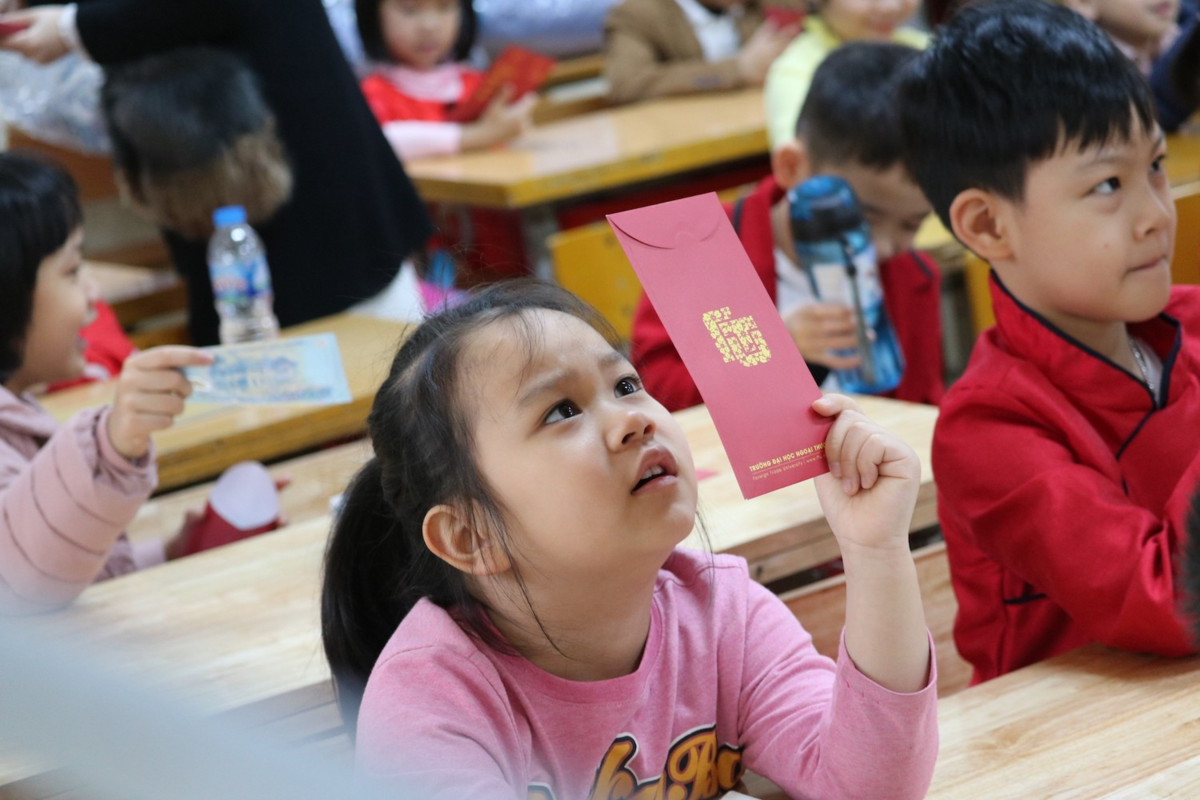 Cô giáo lì xì cho các bạn với những lời chúc may mắn như chăm ngoan học giỏi, mau ăn chóng lớn, nghe lời bố mẹ- thầy cô...