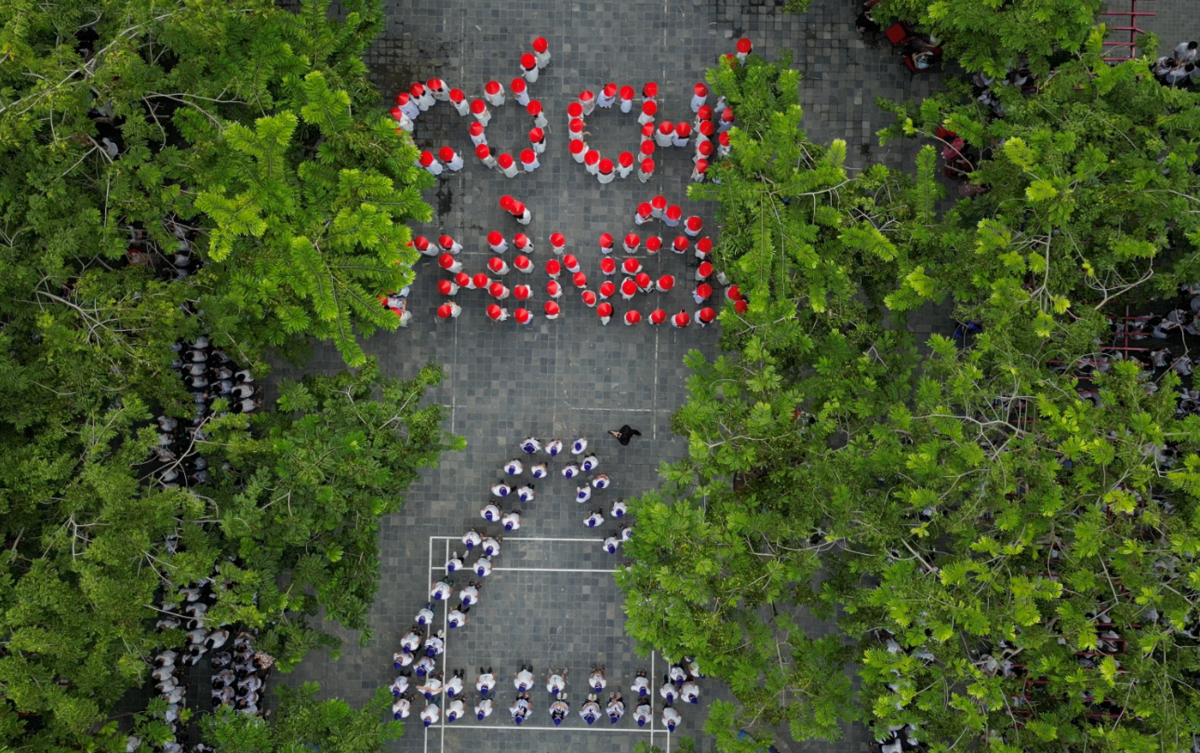 Học sinh mặc áo dài, đội nón lá xếp chữ ở sân trường Lương Thế Vinh.