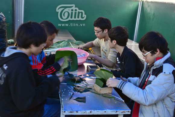 Mọi công đoạn từ rửa lá dong, gói bánh, nhóm củi, nấu bánh... đều do các bạn ấy tự tay thực hiện. (Theo Tiin)