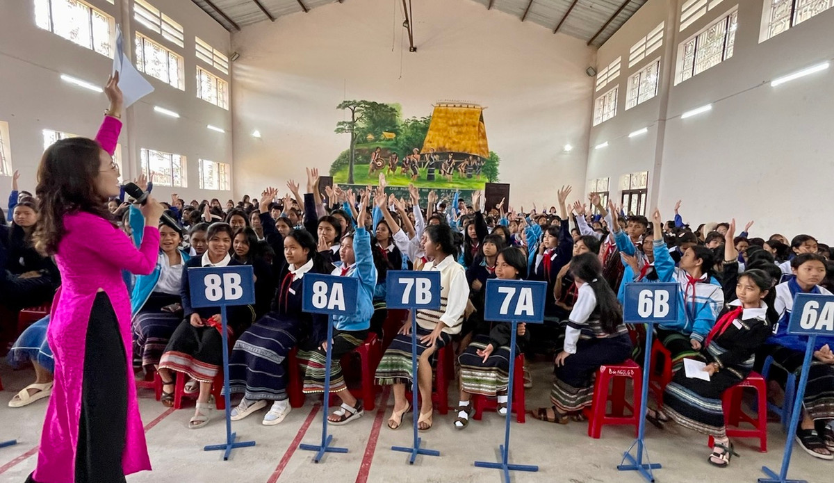 Học sinh hào hứng tham gia các phần thi kiến thức hỏi đáp dành cho khán giả.
