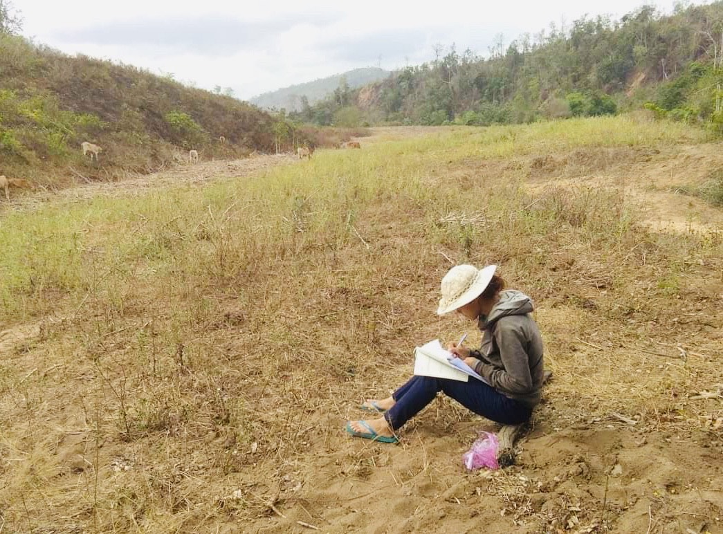 Em Đinh Thị Mỹ Lệ thủ bắt sóng điện thoại để học trong lúc chăn bò.