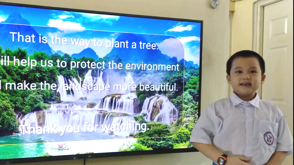 Em Nguyễn Phú Hải, học sinh lớp 1 A7, trường tiểu học Cao Bá Quát (Gia Lâm, Hà Nội) diễn thuyết bằng tiếng Anh với chủ đề: Hết dịch bạn sẽ làm gì.