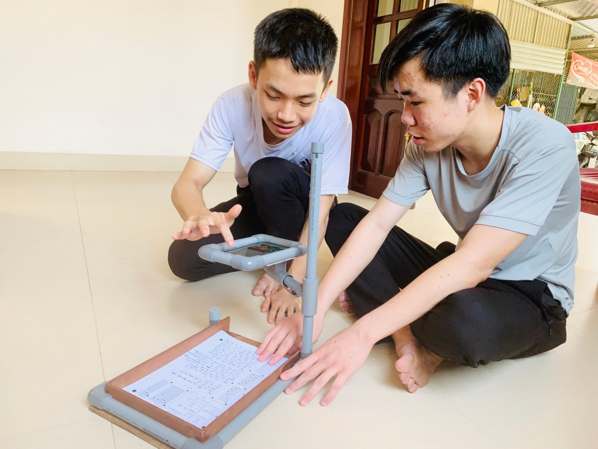 Chia sẻ về ý tưởng làm giá chấm thi trắc nghiệm, em Mậu Đức cho hay, khi thấy giáo viên mất thời gian cho quá trình chấm thi, nam sinh lên ý tưởng, tham khảo ý kiến thầy giáo, sau đó gọi thêm 3 bạn trong lớp cùng hỗ trợ. Tận dụng thời gian rảnh rỗi sau giờ học, những ngày nghỉ cuối tuần, cả nhóm lại cùng nhau bàn bạc để thiết kế hoàn thành sản phẩm đúng như kỳ vọng.