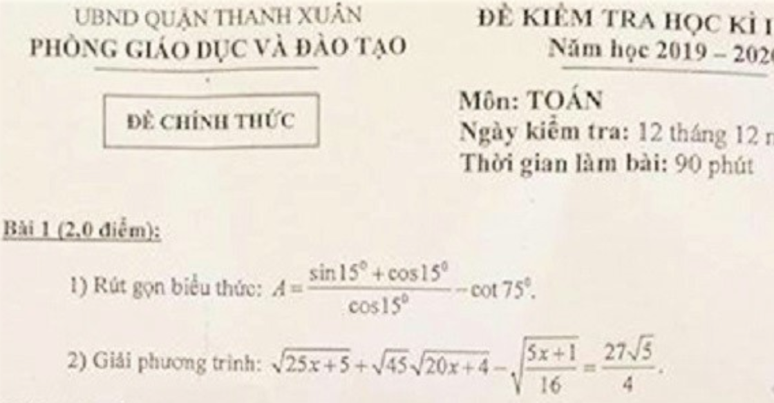 Đề thi Toán học kỳ I ngày 12/12 của quận Thanh Xuân, Hà Nội.