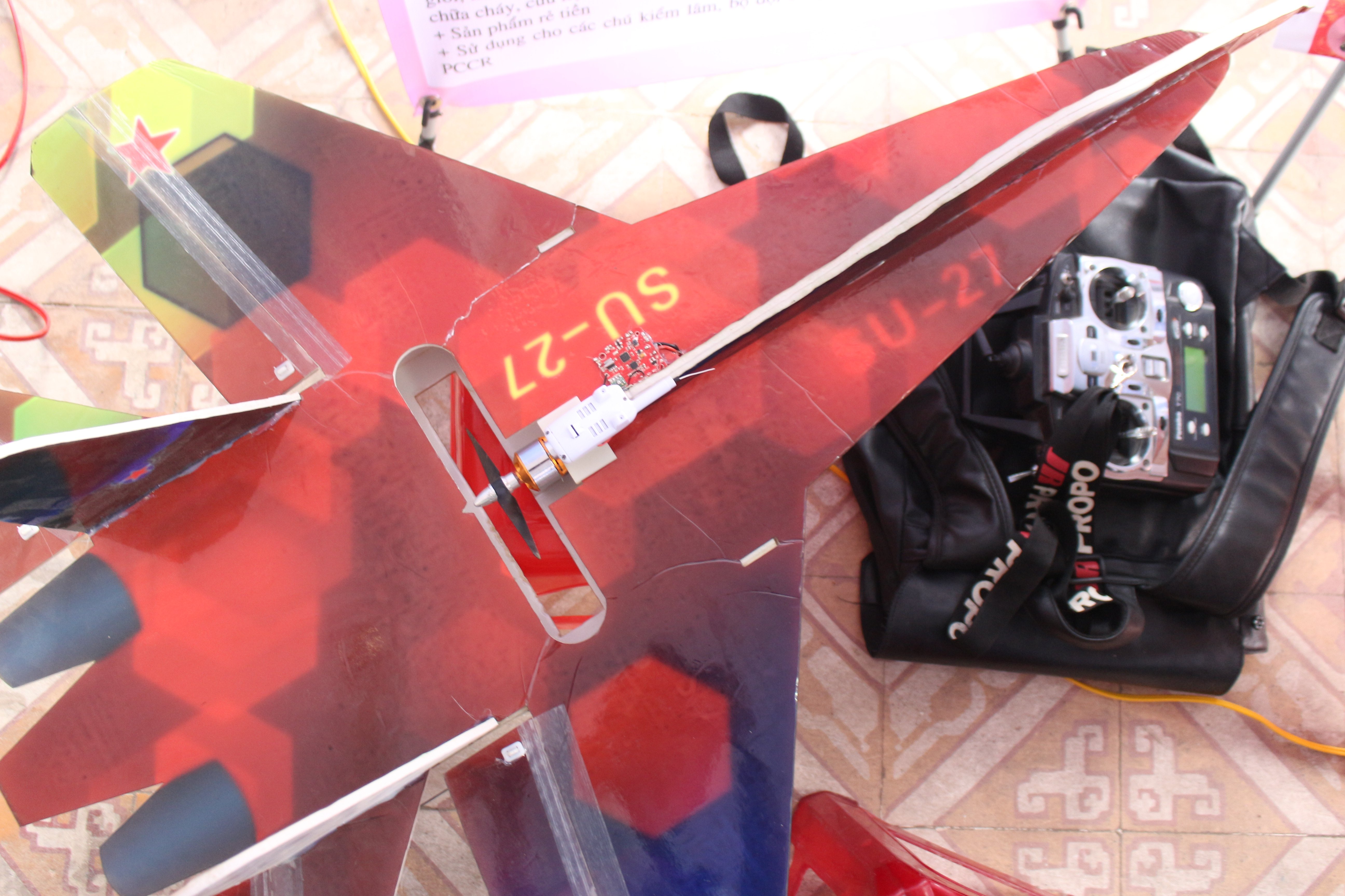 Mô hình máy bay của Đức được gắn thêm một camera lấy từ thiết bị Flycam để có thể thực hiện chức năng thăm dò đám cháy. (Ảnh: Tuấn Hiệp)