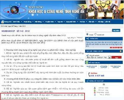 | Thông tin về đề tài "Nghiên cứu đặc điểm dịch tế Thalassemia và một số liên quan ở trẻ em dân tộc Thái và H'Mông của Nghệ An" được đăng tải trên website Sở KH&CN Nghệ An |