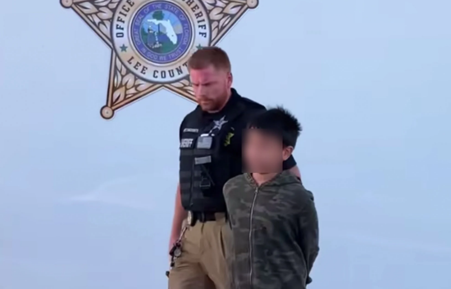 Cậu bé bị cảnh sát áp tải ra xe tuần tra. (Ảnh: Văn phòng Cảnh sát trưởng hạt Lee)