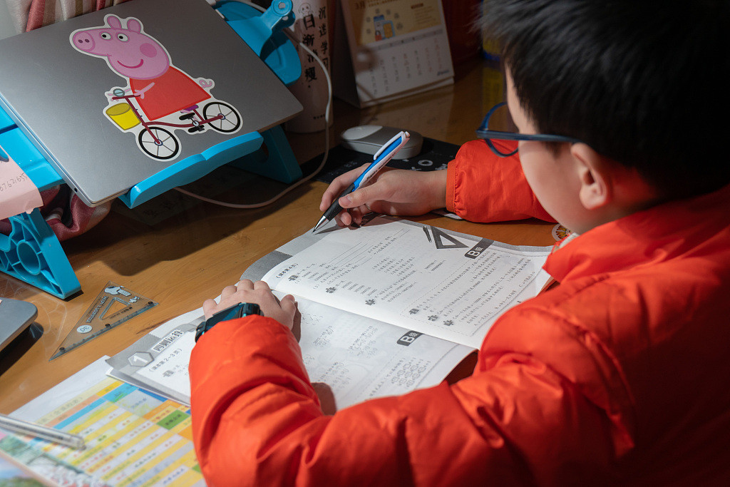 Một cậu bé ở Thượng Hải, Trung Quốc, làm bài tập về nhà, tháng 3/2020. (Ảnh: VCG)