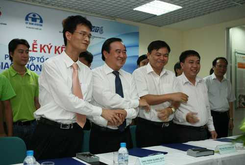 | Tổng Giám đốc VTC Nguyễn Xuân Cường và lãnh đạo các Bộ, Ban, Ngành chúc mừng sự hợp tác phối hợp tổ chức cuộc thi sẽ đem lại thành công tốt hơn mong đợi |