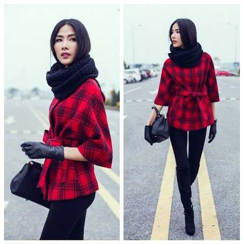 | Cũng với thời trang tartan, Hoàng Thùy ra dáng quý cô với kiểu áo cột eo duyên dáng. Phối với quần legging và bốt cao cổ, Quán quân Vietnam's Next Top Model 2011 thách thức mùa đông và sành điệu đón lễ. |