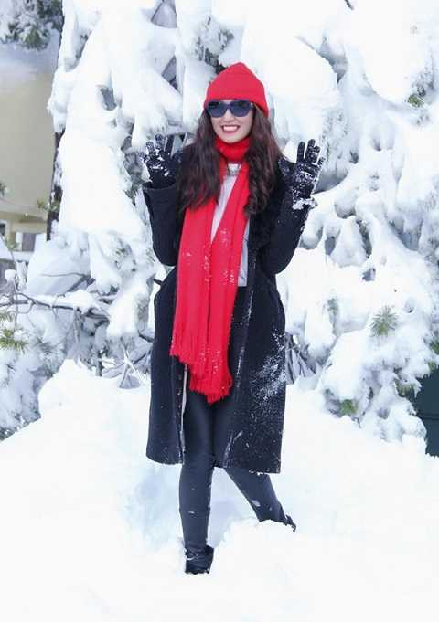| Chỉ cần mũ đỏ, khăn đỏ là đủ tạo nên không khí Giáng Sinh rồi. Phụ kiện giúp Khánh My thêm rạng rỡ và phù hợp với không gian thông xanh, tuyết trắng này. |