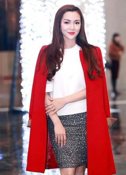 | Ca sĩ Ngọc Anh nổi bật với áo khoác đỏ trong ngày đông. Áo trắng phối tinh tế với váy bút chì ánh kim cùng áo khoác đỏ tạo nên set đồ hoàn hảo cho đêm Giáng Sinh. |