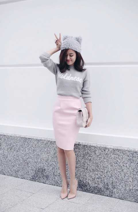 | Dù không màu sắc rực rỡ nhưng nhìn vào Hoàng Thùy Linh là đã thấy Giáng Sinh đang ở quanh đây. Cô nàng tạo dáng nhí nhảnh với chiếc mũ beanie cùng áo sweater xám bạc, váy bút chì và giày hồng pastel. |