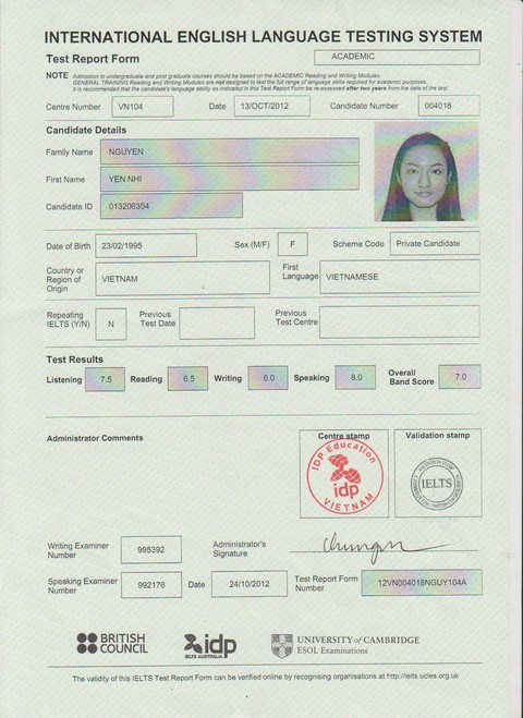 Bảng điểm Yến Nhi, 7.0 IELTS – Du học sinh Canada