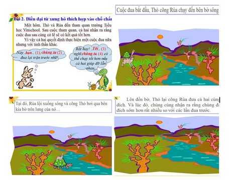 Trong các bức tranh minh hoạ cho câu chuyện Thỏ - Rùa, cô giáo để trống những phần có đại từ nhân xưng để học sinh tự tìm và điền vào. Nội dung đầy bất ngờ này khiến các em học sinh lớp 5A4 hồi hộp theo dõi và hào hứng trước một tiết học rất “khoai” về Đại từ xưng hô cũng như học được tinh thần “cùng thắng” để cùng đạt tới thành công.