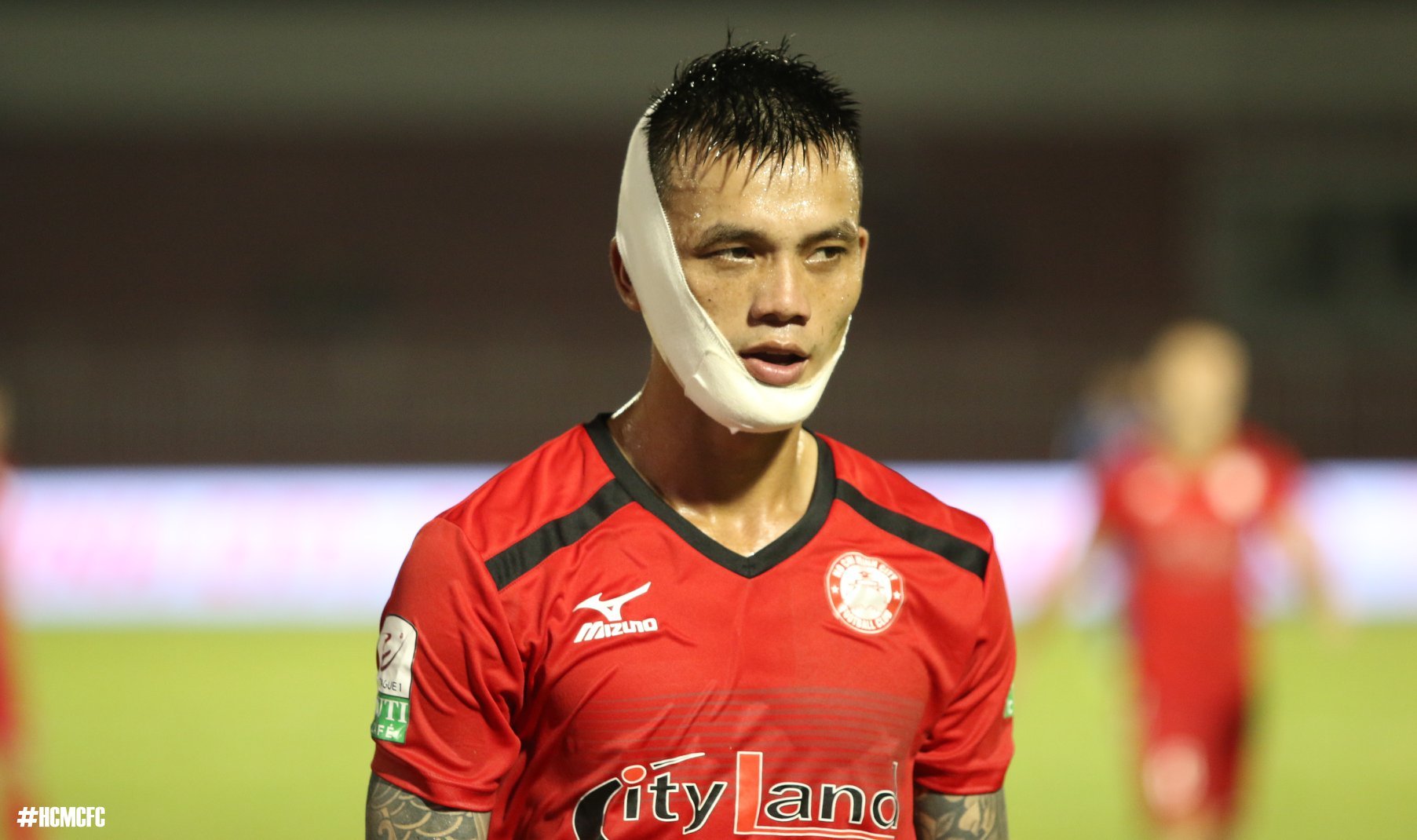 Trung vệ Nguyễn Hữu Tuấn của TP.HCM bị rách da đầu và mất máu khá nhiều máu. Anh được bác sĩ đội nhà khuyên nên rời sân để tránh ảnh hưởng đến chấn thương.
