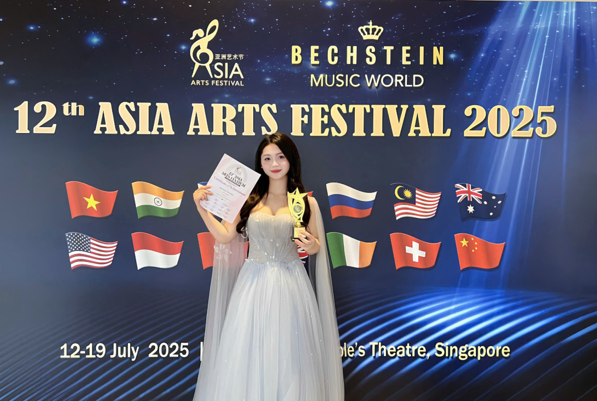 Nguyễn Thanh Chúc vừa giành Cúp Vàng tại Liên hoan nghệ thuật châu Á - Asia Artist Festival 2025 (AAF) tổ chức ở Singapore. Thành tích này không chỉ là dấu mốc đáng nhớ trong hành trình âm nhạc của cô gái trẻ, mà còn là “trái ngọt” đầu tiên sau ba năm rèn luyện nghiêm túc dưới sự dẫn dắt của giảng viên - ca sĩ Đào Nguyên Vũ.