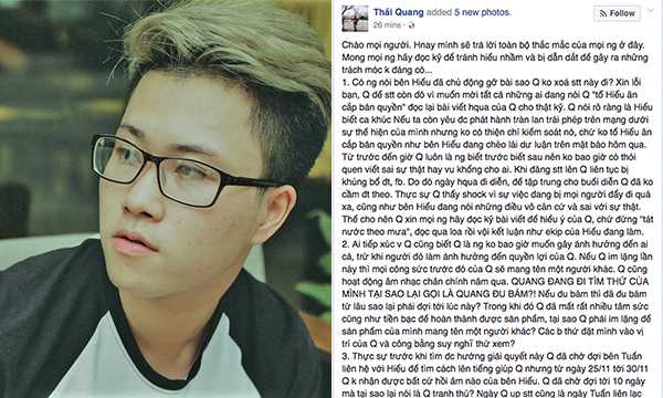 Chỉ khi mình đăng status bên Hiếu mới liên hệ để gỡ bài 1 cách rất nhanh chóng. Nhưng bên Hiếu lại lên báo nói ngược với sự thật là "Bên mình đã chủ động gỡ bài xuống trước đó nhưng không hiểu sao Thái Quang vẫn đăng đàn nói vậy? Thế có phải là ngược đời, đổi trắng thay đen quá không?”