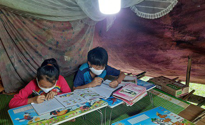 Chiếc lán đơn sơ nơi hai anh em Quang-Viên học trực tuyến.