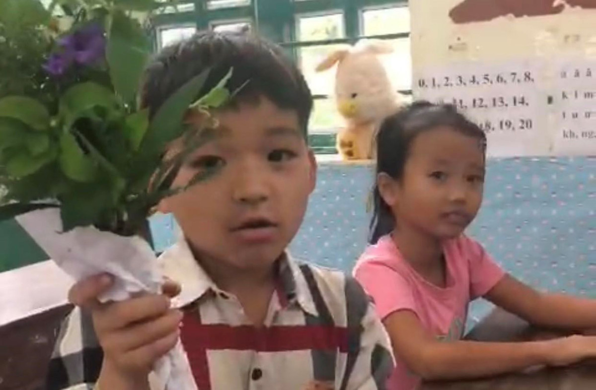 Trong clip, không phải hộp quà được gói đẹp đẽ, cũng chẳng có bông hồng đỏ, cúc vàng, món quà của học sinh vùng cao mang đến lớp tặng cô giáo là những bông, hoa dại bên đường, hoặc trong vườn nhà. Hoa được cẩn thận gói ghém bằng giấy báo.
