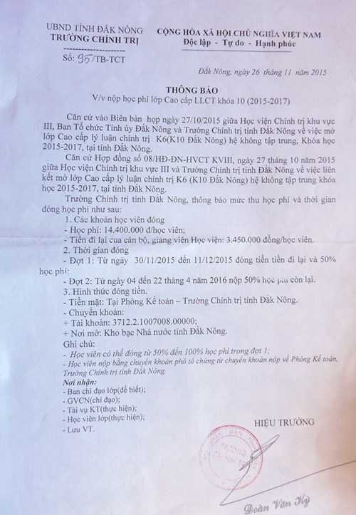 Hiệu trưởng trường Chính trị tỉnh Đắk Nông đã ký quyết định yêu cầu ngoài tiền học phí, mỗi học viên phải đóng 3,5 triệu đồng tiền taxi đưa đón giảng viên.