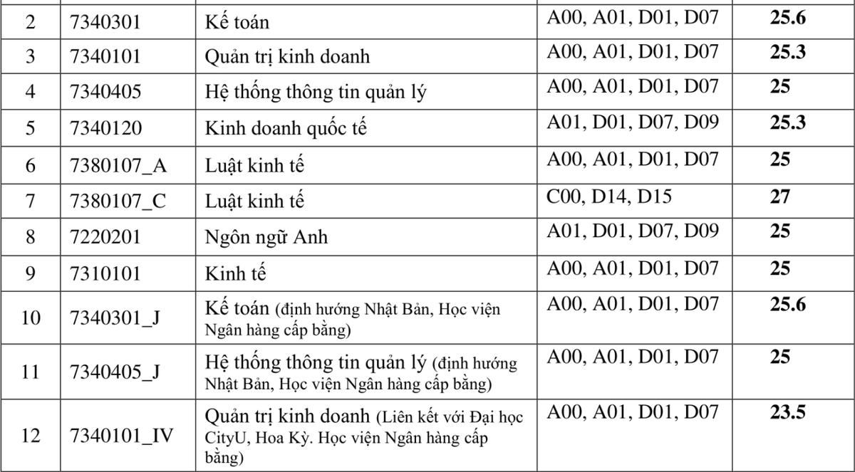Điểm chuẩn trúng tuyển vào Học viện Ngân hàng năm 2020 cao nhất là 27 với ngành Luật kinh tế (khối C00, D14, D15), thấp nhất 21,5 điểm ngành Kế toán.