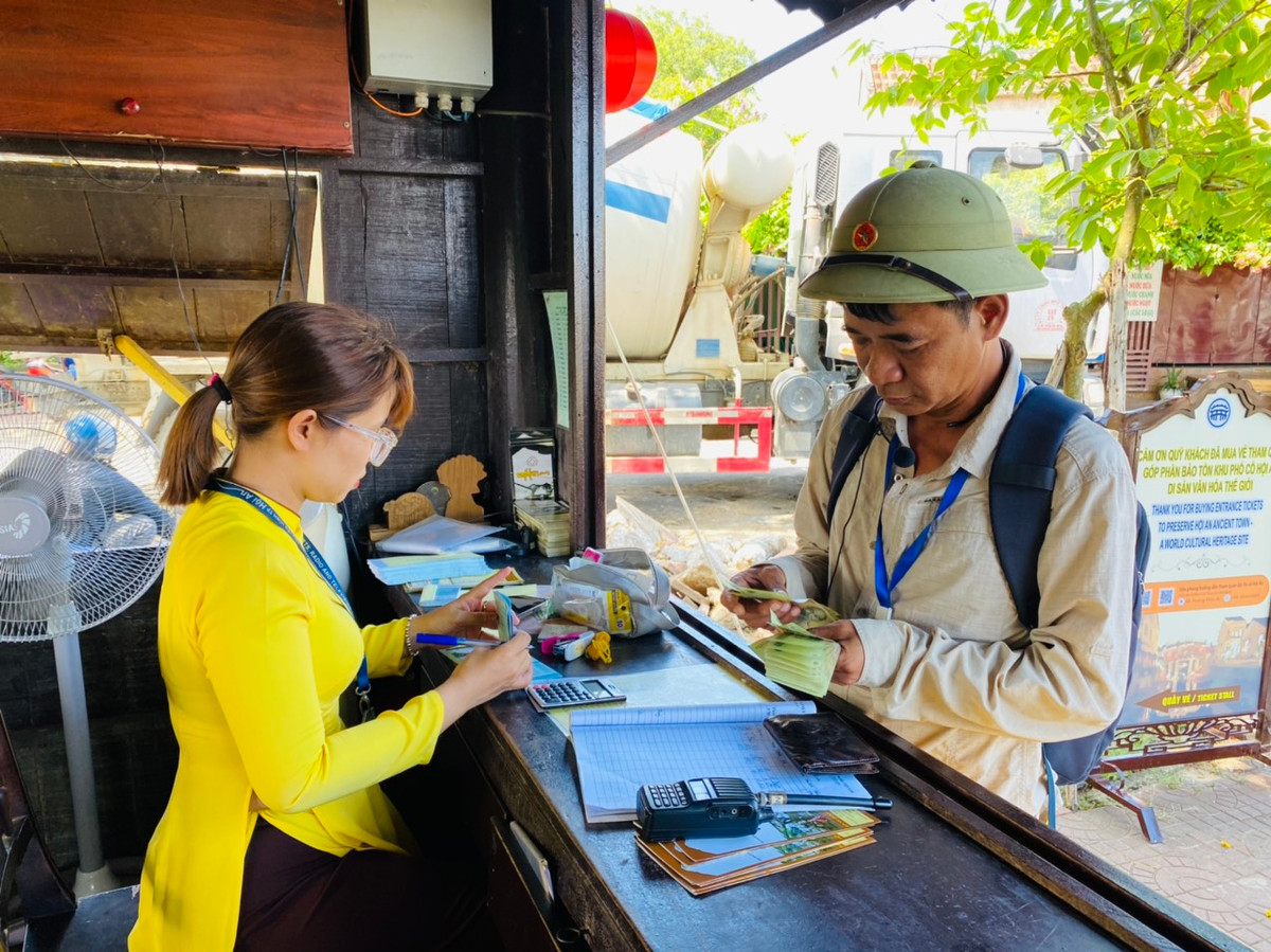 Hướng dẫn viên mua vé cho đoàn khách tham quan phố cổ Hội An trong ngày 15/5.