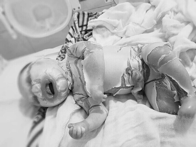 Phó giáo sư Trần Minh Điển, Phó Giám đốc Bệnh viện Nhi Trung ương, cho biết da bé căng cứng, nứt sâu, tiên lượng rất dè dặt do nguy cơ cao nhiễm khuẩn kèm suy hô hấp, mất nước, rối loạn thân nhiệt, ăn uống khó khăn.