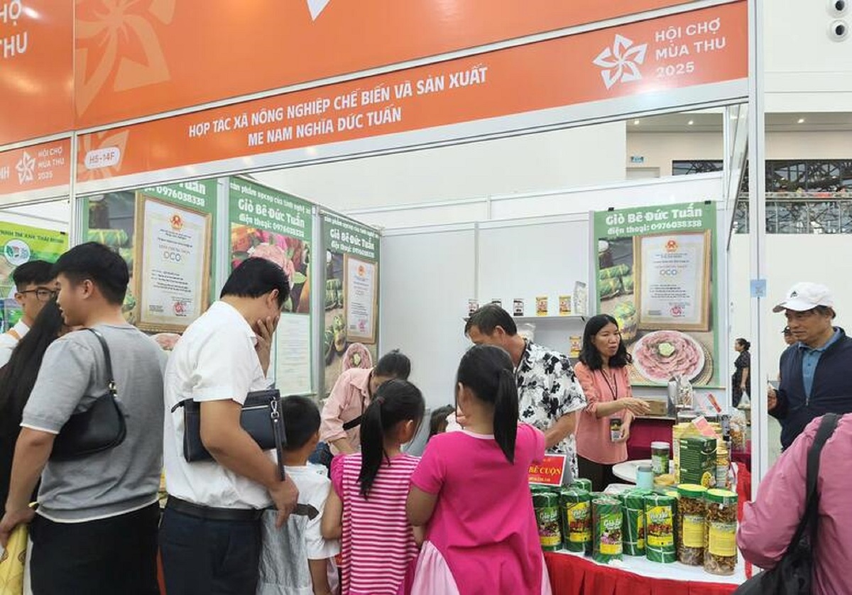 Gian hàng của Công ty TNHH Sản xuất nấm ăn, nấm dược liệu Mù Cang Chải (Lào Cai) tại Hội chợ mùa Thu lần thứ nhất 2025 tấp nập khách tham quan, trải nghiệm sản phẩm.