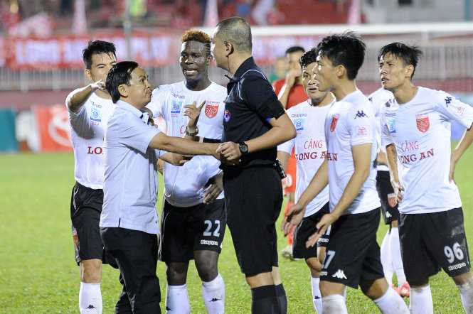 Nguyên chủ tịch CLB Võ Thành Nhiệm cùng các cầu thủ Long An phản ứng trọng tài Nguyễn Trọng Thư trong trận đấu với chủ nhà TP.HCM ở vòng 6 V-League 2017.