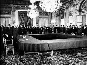 | Quang cảnh cuộc nói chuyện giữa Chính phủ Việt Nam Dân chủ cộng hòa và Chính phủ Hoa Kỳ ề hòa bình tại Việt Nam tại phòng họp trung tâm hội nghị quốc tế ở Paris ngày 13/5/1968. (Ảnh tư liệu/TTXVN) |