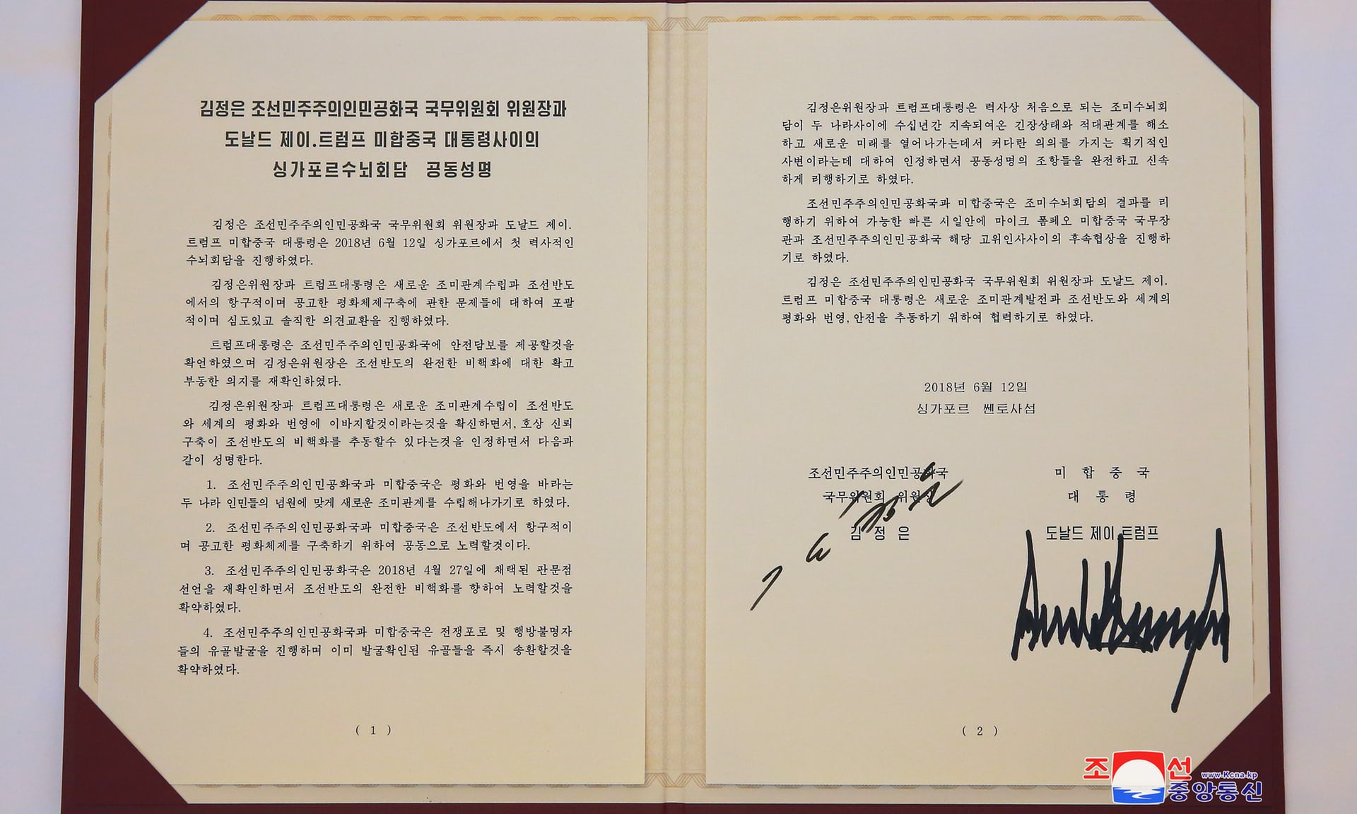 Hội nghị thượng đỉnh Mỹ - Triều được tổ chức lần đầu tiên ngày 12/6 tại Singapore kết thúc với thỏa thuận bao gồm 4 điểm chính: đồng ý thành lập mối quan hệ song phương mới; quyết định hợp tác xây dựng cơ chế hòa bình lâu dài và ổn định trên bán đảo Triều Tiên; tái khẳng định cam kết của Bình Nhưỡng về phi hạt nhân hóa; hồi hương di thể của những binh sỹ Mỹ thiệt mạng trong chiến tranh – dù là tù binh hay người mất tích – trong cuộc chiến tranh 1950 – 1953.