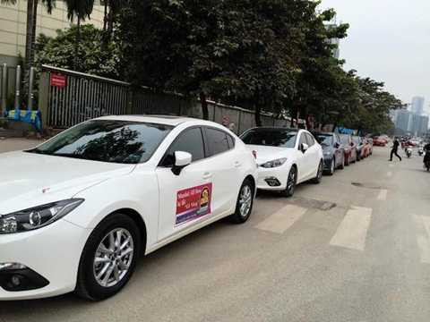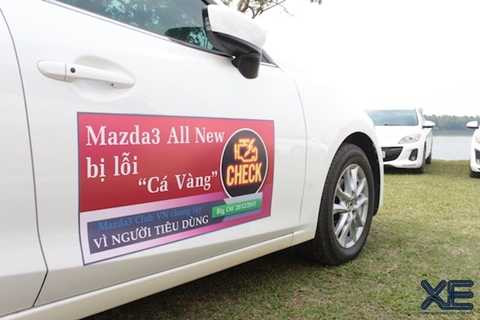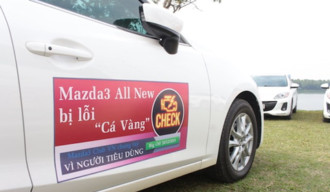 | Thành viên CLB Mazda 3 dán đề-can bêu tên lỗi "nổi cá vàng" bên hông xe |