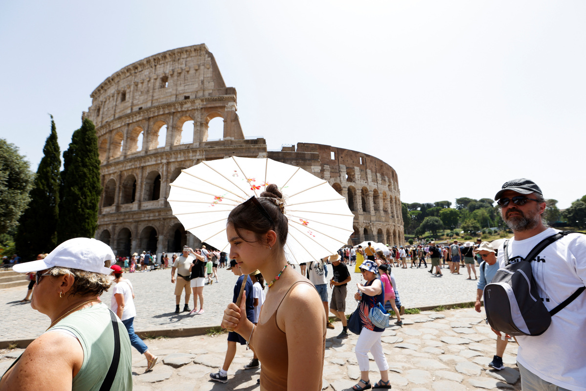 Khách du lịch tham quan Đấu trường La Mã ở Rome bất chấp các cảnh báo của các nhà chức trách về đợt nắng nóng kỷ lục ở Italia suốt 2 tuần qua. (Ảnh: Reuters)