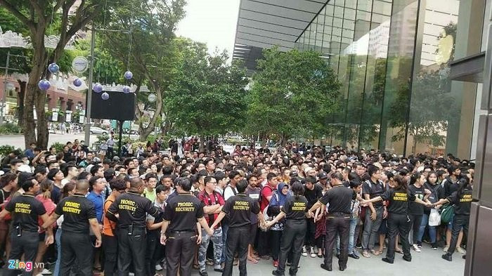 Ngoài người Việt, có thêm hàng trăm người Malaysia, Ấn Độ, người Hoa bản địa kéo về khu vực này. Khoảng 16h20 (17h20 giờ địa phương), nhân viên Apple Store Singapore bắt đầu lập rào chắn để chuẩn bị cho việc xếp hàng mua iPhone X.