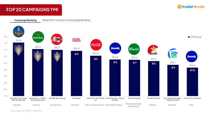 Theo thống kê của YouNet Media, trong gần 3 tháng Tết 2024 đã có hơn 130 chiến dịch Tết từ 20 ngành hàng khác nhau, tạo ra 20,6 triệu thảo luận trên mạng xã hội. Giữa hàng loạt những dự án được tung ra, chiến dịch “Tết Ấm App” của Home Credit gây được tiếng vang lớn khi là thương hiệu duy nhất ngành tài chính tiêu dùng có mặt trong top 4 BXH YMI 20 chiến dịch Tết 2024 nổi bật nhất trên mạng xã hội.