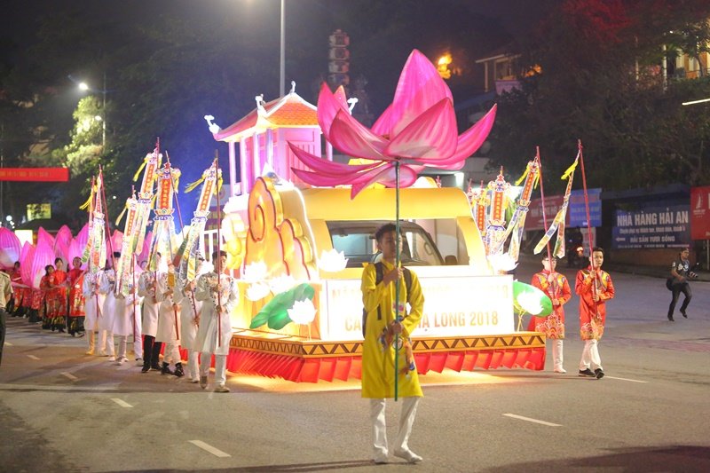 Tối qua, 26/4, người dân và du khách tới Hạ Long đã có một đêm không ngủ, khi các tuyến phố chính tại Bãi Cháy bừng sáng bởi 12 xe hoa lung linh cùng gần 1000 diễn viên trong trang phục đủ màu sắc rực rỡ.