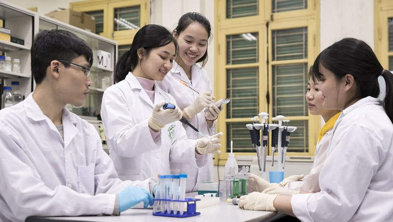 Sinh viên thực hành hoá học. (Ảnh: T.N)