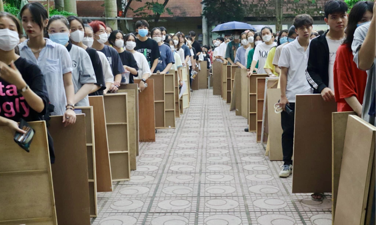 Thí sinh ngay ngắn xếp hàng chờ vào phòng thi.