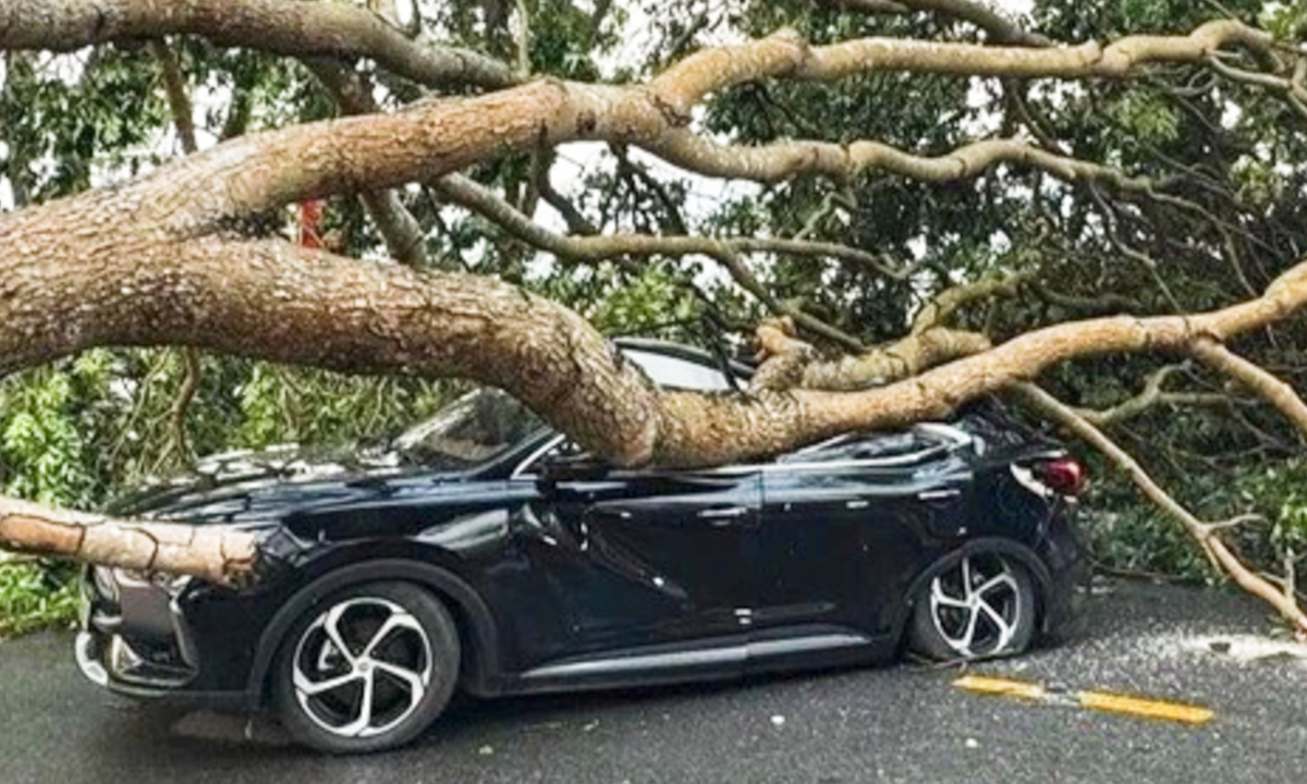 Cây đổ vào xe ô tô tại Khu di tích lịch sử Đền Hùng, Phú Thọ. (Ảnh: Hoàng Lan)