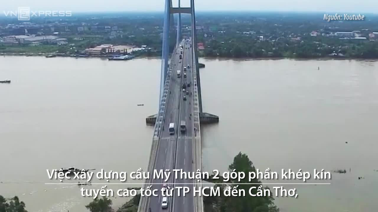 Cầu Mỹ Thuận 2 vượt sông Tiền, nằm trên tuyến đường cao tốc từ TP HCM đi Cần Thơ có chiều dài 5.800m.