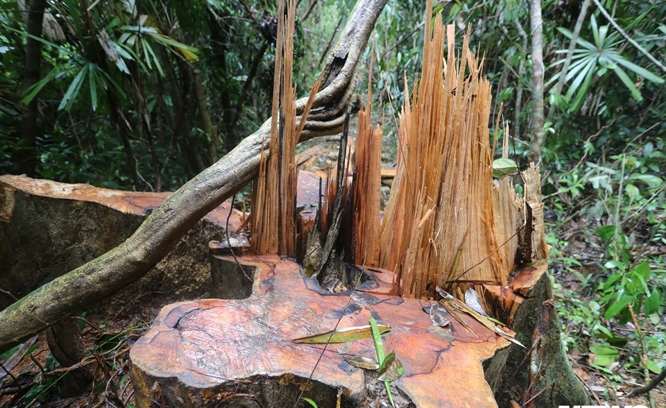 Hàng chục cây cổ thụ ở rừng phòng hộ Sông Tranh thuộc xã Trà Giác bị lâm tặc đốn hạ vào năm 2019.