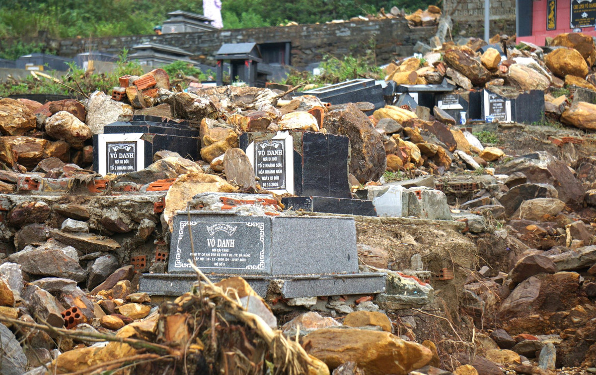 Nhiều ngôi mộ bị sạt lở, hư hại sau mưa lũ lịch sử.