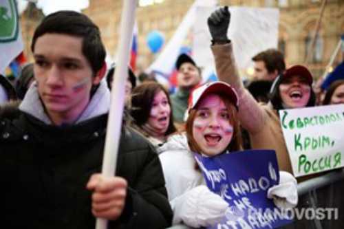 Quốc kỳ Nga phấp phới bay trên cột cờ của rất nhiều doanh nghiệp cũng như trên cửa sổ của các quán cà phê và cửa hiệu hôm 18/3, trong khi những chiếc xe mang biểu ngữ “Sevastopol-Crưm-Nga,” “Crưm muôn năm!” “Crưm là nước Nga” nhộn nhịp lăn bánh trên đường phố của thủ đô Moskva.