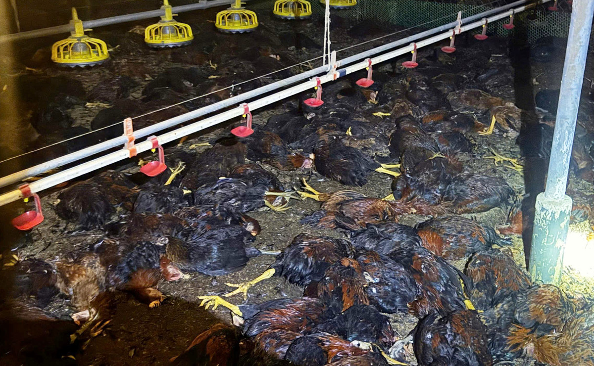 Đàn gà hơn 8.000 con của gia đình chị Nguyễn Thị Thơm lăn ra chết hàng loạt do hệ thống quạt thông gió bị hỏng. (Ảnh: CTV)
