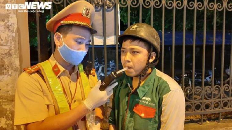 Đội CSGT số 6, Phòng CSGT Hà Nội kiểm tra nồng độ cồn của tài xế xe máy.