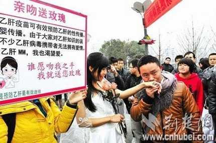 Tại quảng trường lớn Quang Cốc ở Vũ Xương (Hồ Bắc, Trung Quốc), một cô gái mắc bệnh viêm gan B đã dũng cảm treo tấm biển có dòng chữ “Một nụ hôn tặng hoa hồng” và chỉ 30 phút sau đó, 10 bông hoa hồng tượng trưng cho tình yêu đã tìm được chủ.