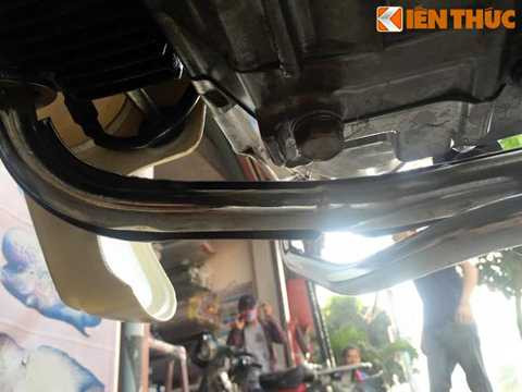 | Bên dưới gầm xe, thân máy cũng hoàn toàn sạch sẽ, không hề dính bùn đất hay dầu mỡ, cho thấy rằng chiếc Dream này đã không được sử dụng và chỉ nằm "đắp chiếu". |
