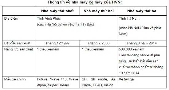 Thứ hai, Honda Việt Nam đã mở rộng năng lực sản xuất của phân xưởng sản xuất bánh răng lên hơn 2,3 triệu sản phẩm/năm, đồng thời phân xưởng sản xuất Piston cũng đã hoàn thành và đi vào hoạt động từ tháng 04/2014. Thứ ba, trung tâm phụ tùng sắp bắt đầu đi vào hoạt động với tổng diện tích và vốn đầu tư lớn. Trong năm 2013, Honda Việt Nam đã xuất khẩu đi các nước 40.000 xe và mục tiêu xuất khẩu trong năm 2014 là 100.000 xe.
